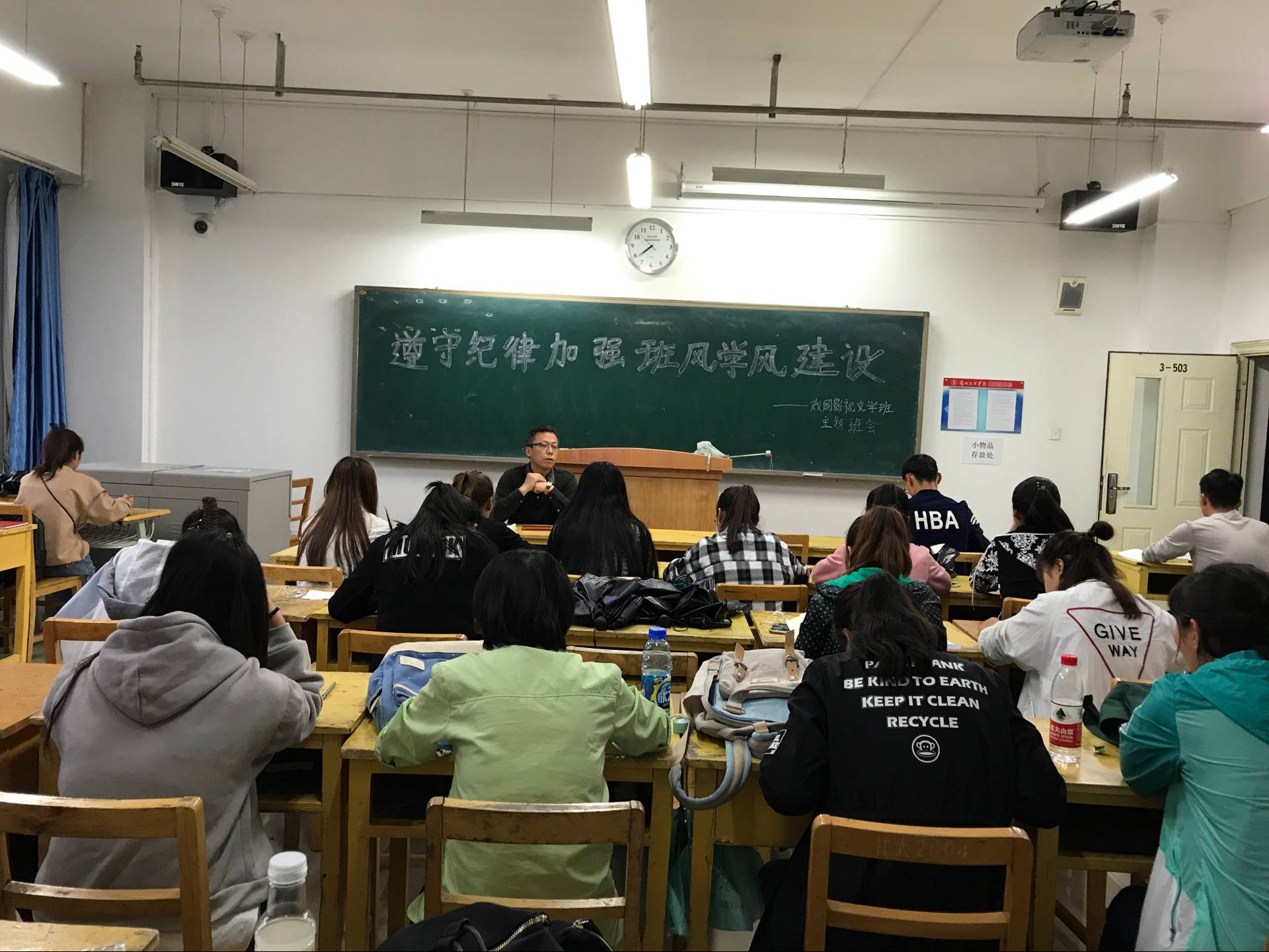 在生活以及安全方面,凌老师为同学们指出校园内以及其他高校中学生普遍存在的不良行为习惯。凌老师提出,本班同学不得出现晚归情况,周五空课需要外出则必须向班主任请假方可离校,禁止将任何形式的宗教活动带入校园班级和宿舍。凌老师还指出大家应该规范自己的言行举止,穿着打扮应符合大学生的身份,不得在互联网上恶意诋毁他人以及攻击党和国家的言论、不信谣不传谣。