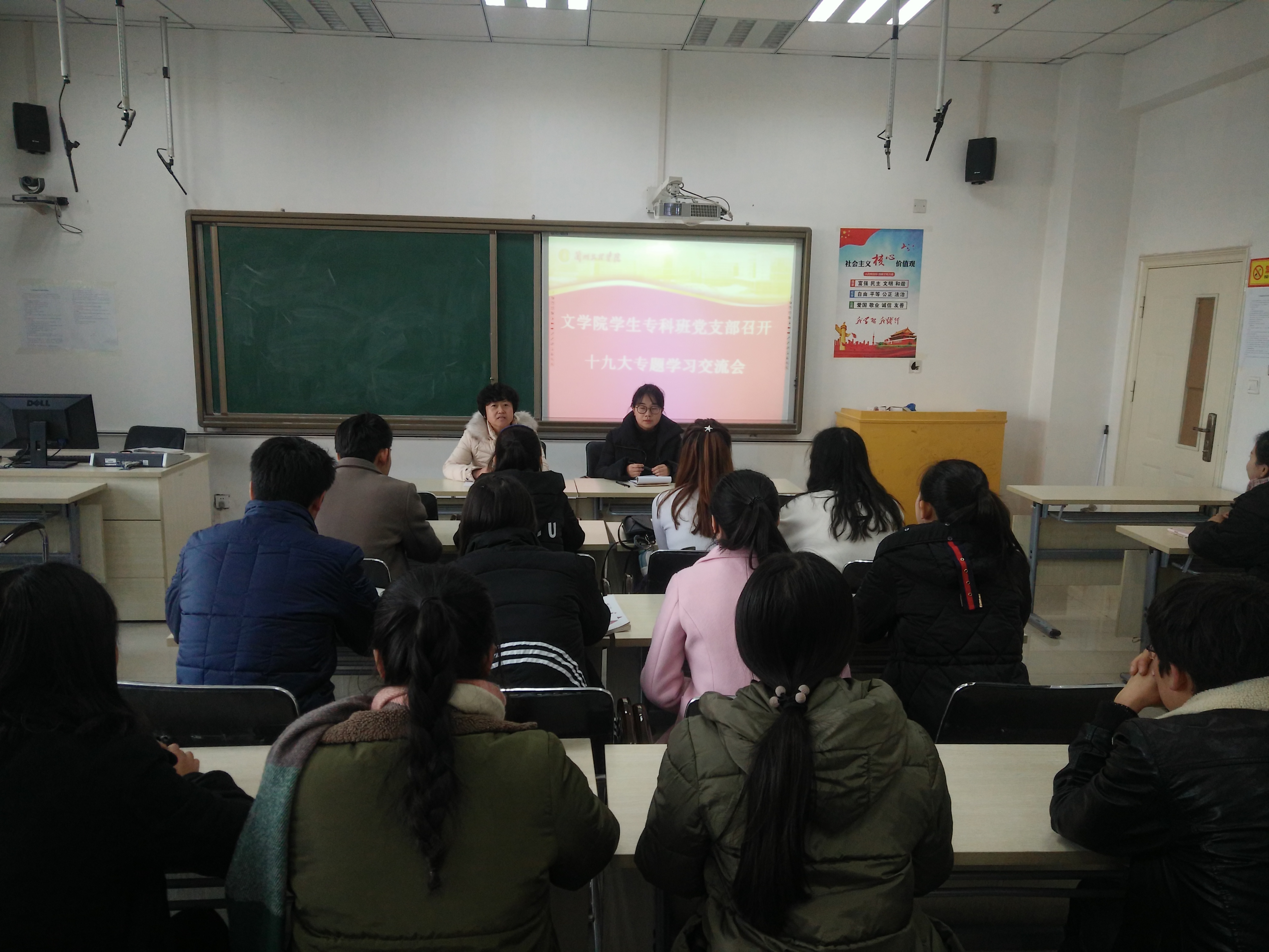 2017年12月7日下午,yl23455永利官网专科班党支部在综合楼5—606召开“十九大精神”学习交流会,yl23455永利官网专科班党支部组织委员张春霓老师,宣传委员赵娅红老师,专科班19名预备党员以及5名发展对象参加了此次会议,会议由组织委员张春霓主持。