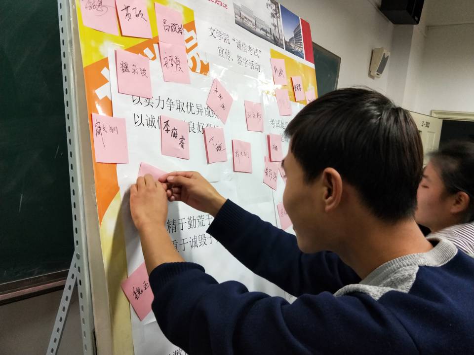 活动开展期间,各个班级积极响应号召,在“诚信考试 杜绝作弊”主题班会上,有老师表示,诚信是做人的根本,要学会做人,不给大学生涯留下遗憾。使同学明确懂得“诚信”的含义,理解“诚信”对学生自身发展和为人处世的重要意义,希望同学们继续大力开展有目标、有计划的学习。告诫同学们在接下来的时间里要认真复习,积极备考,树诚信、扬正气,用端正的态度对待每一场考试。同学们踊跃发言,分享关于诚信的感悟与理解,内容涉及到学习、工作、生活等诸多方面,气氛积极活跃。此外,学生会还组织开展了诚信考试展板签名活动,同学们在便签上写下诚信考试的承诺并署名,张贴在展板上。