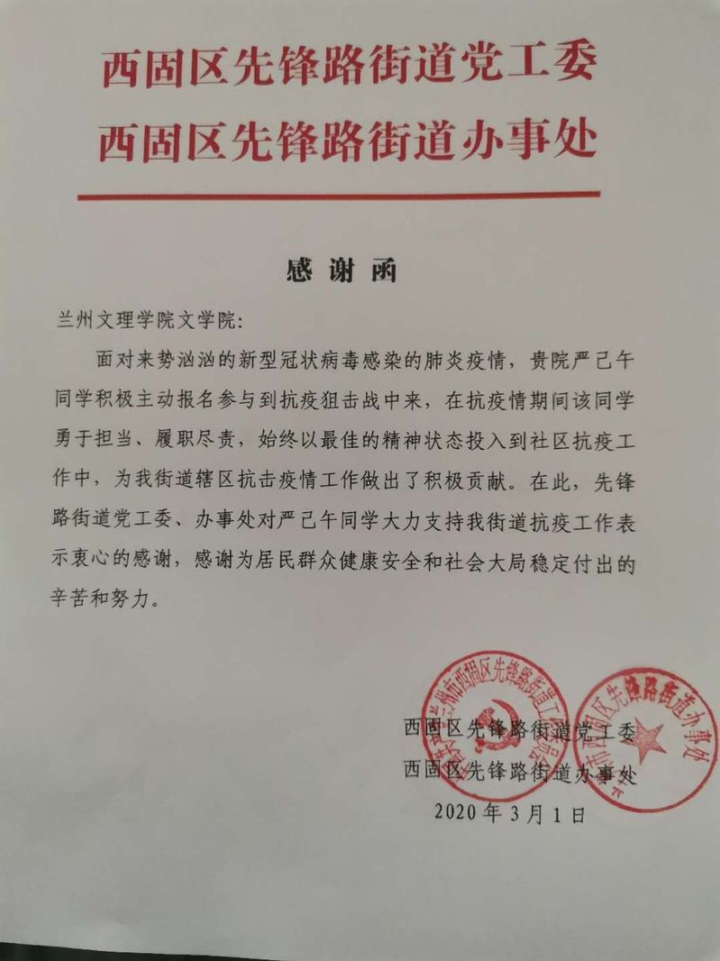 yl23455永利官网2019级汉语言文学三班的严己午同学就是这场战役中的榜样。他在这场没有硝烟的战争前主动报名,积极投身到西固区抗疫的狙击战中。在抗疫期间勇于担当、履职尽责,始终以最佳的精神状态投入到社区抗疫工作中,为西固区抗击疫情工作做出了积极贡献,得到了西固区先锋路街道党工委及西固区先锋路街道办事处的肯定与表扬。