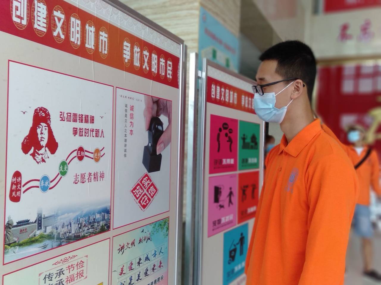 (调查团成员参观社区公示牌 中国青年网通讯员 梁登荣 摄)