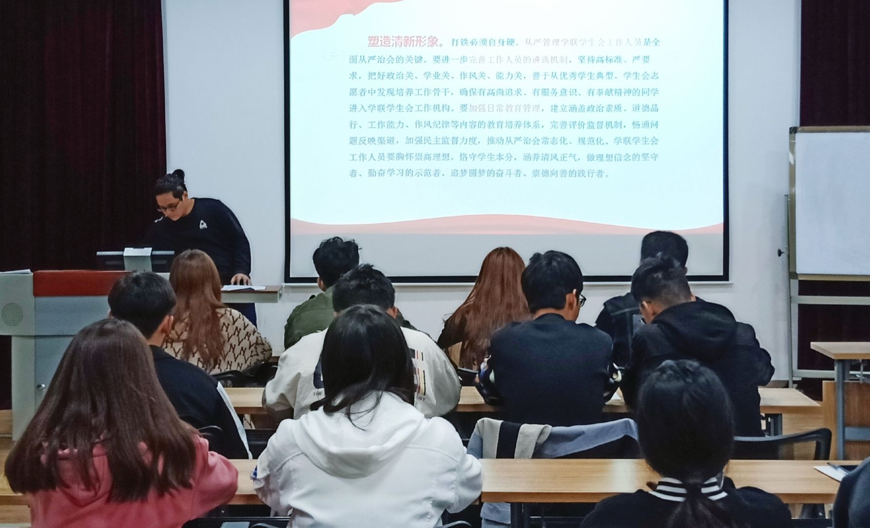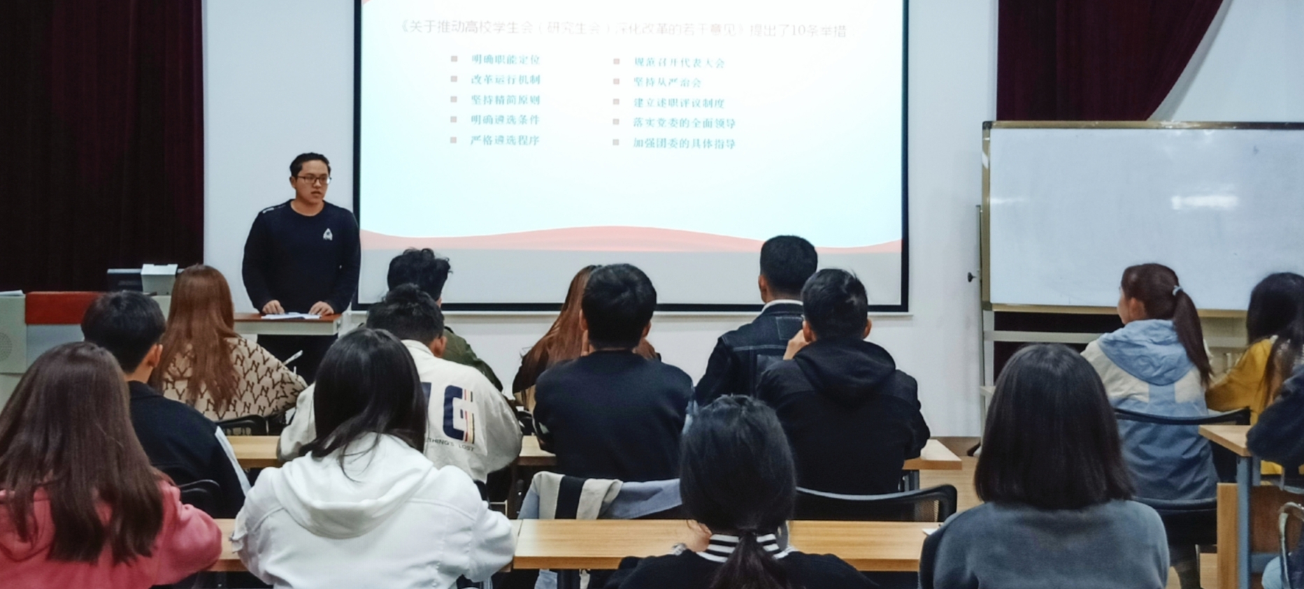 活动伊始,在分团委副书记路雨龙的讲解下,全体参会人员通过PPT共同学习了习近平总书记致全国青联十三届全委会、全国学联二十七大的贺信精神和党中央致词、全国学联二十七大的基本情况,全国学联工作报告的主要内容,《中华全国学生联合会章程》的修改情况,全国学联《关于学联学生会工作人员改进作风服务同学的若干规定》。学习期间,分团委副书记路雨龙分享了他自己对于身处国家和社会危难之时,青年人如何来肩负自身的时代使命和历史重担的思考和感悟,号召同学们牢记习总书记关于新时代青年的殷切期望,谆谆教诲,不忘初心,牢记使命,勇担时代赋予的重任,展现青春的磅礴力量。