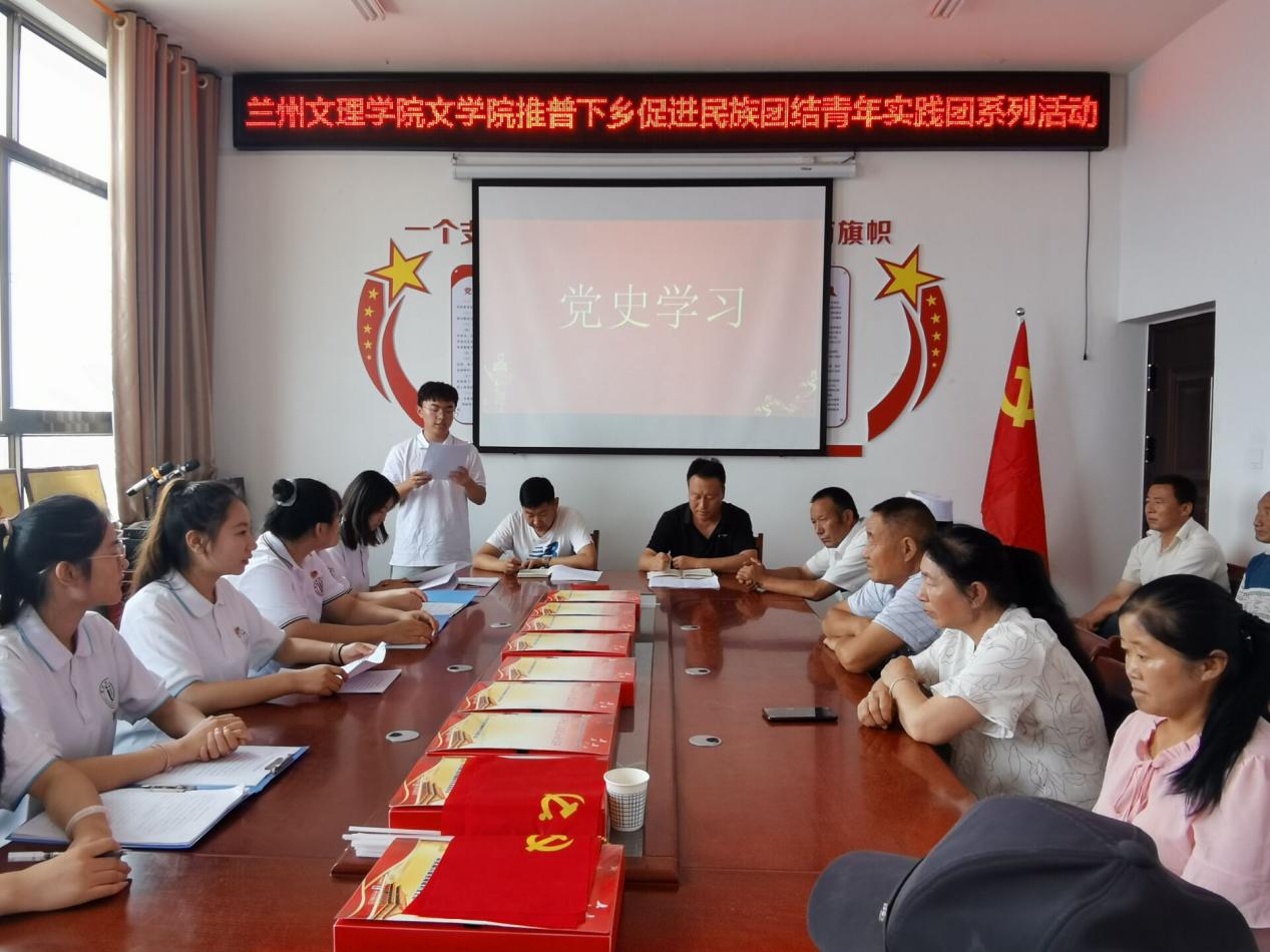 为了助力乡村文化振兴,7月19日,yl23455永利官网“推普下乡促进民族团结”青年实践团来到庆阳市庆城县桐川镇党崾岘村。在当地驻村干部协助下,实践团开展了yl23455永利官网“推普下乡促进民族团结”青年实践团系列活动。活动包括党史学习教育、习近平总书记“七一”重要讲话精神分享学习、“民族团结一家亲”政策宣讲等。