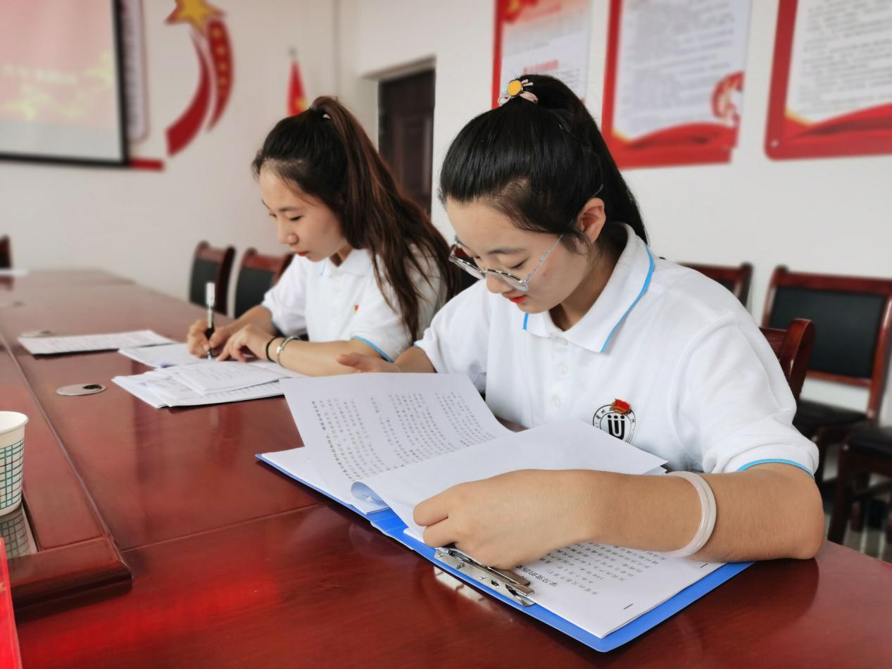 做好准备,有条不紊。为了确保活动能够有序进行,一大早,实践团就到达了党崾岘村党支部进行了紧张的筹备工作。学校驻庆城县桐川镇党崾岘村第一书记兼工作队队长俞兴龙老师在看了队员们对这次活动所准备的材料后,提出了需要结合当地实际进行活动准备的修改意见,并引导队员们进行思考。队员们意识到,在宣讲活动中,应该将对象确定为当地群众,以通俗的方法进行宣讲,避免不切合实际的空中楼阁。